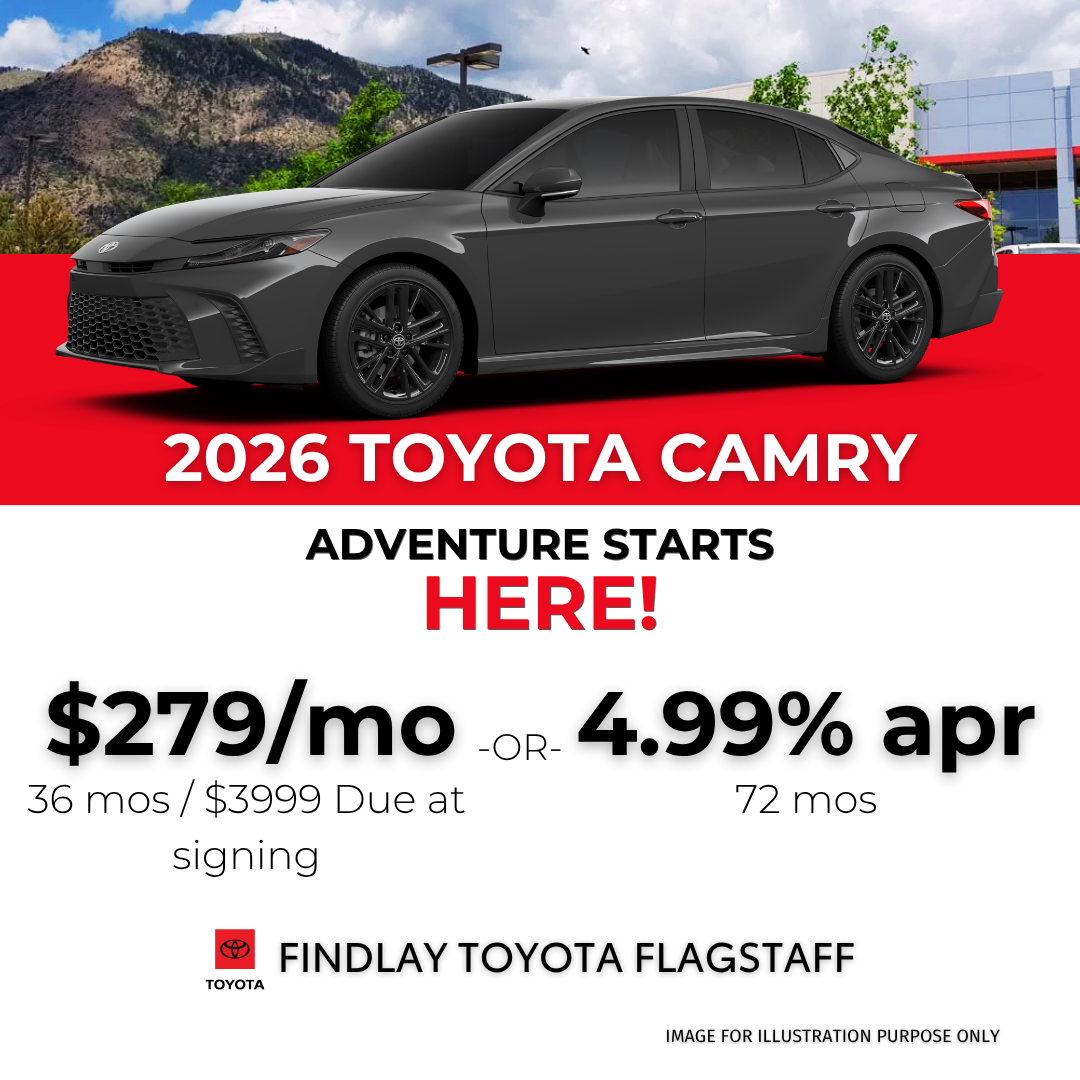 "Lease: Terms available on approved credit through Toyota Financial Services (TFS) at participating Toyota dealers. Not all customers qualify. Lease example based on 2026 Camry 2WD 4Dr. Sedan LE Hybrid CVT Model 2559 with Total SRP of $30,614, net capitalized cost of $25,894, and a lease end purchase amount of $20,511. $3,999 Due At Signing includes $2,970 customer down payment, first month's payment of $279 of the 36 month lease offer, and $750 Acquisition Fee. Security deposit required with exception of prior Toyota Financial Services (TFS) financing history and/or TFS credit rating in which a security deposit may be waived. Tax, title, license are extra. Dealer contribution may vary and could affect lease payment. Individual dealer prices, monthly payment, and other terms and offers may vary. Must lease from participating dealer's stock and terms are subject to vehicle availability. Lessee responsible for maintenance, excess wear and use, and will pay $0.15 per mile for all mileage over 12,000 miles per year. $350 disposition fee is due at lease end. Offer cannot be combined with TFS Finance Cash, Down Payment Assistance, Trade-in Assistance, Customer Cash, APR, Finance Subvention Cash. Excludes 2WD 4Dr. Sedan XSE Hybrid CVT, 2WD 4Dr. Sedan XLE Hybrid CVT, 4WD 4Dr. Sedan XLE Hybrid CVT, 4WD 4Dr. Sedan XSE Hybrid CVT, 4WD 4Dr. Sedan NIGHTSHADE Hybrid CVT, 2WD 4Dr. Sedan NIGHTSHADE Hybrid CVT. Offer available in AZ, CO, NM, NV, UT, WY regardless of buyer's residency; void where prohibited. Expires 05-04-2026. Dealer sets final price. See your participating Toyota dealer for details.Toyota Financial Services is a service mark used by Toyota Motor Credit Corporation (TMCC). Retail installment accounts may be owned by TMCC or its securitization affiliates and lease accounts may be owned by Toyota Lease Trust (TLT) or its securitization affiliates. TMCC is the servicer for accounts owned by TMCC, TLT, and their securitization affiliates." "APR: Qualified customers who finance a new 2026 Camry can receive as low as 4.99% APR for 72 months with 72 monthly payments of $16.10 for every $1,000 financed. Terms available on approved credit through Toyota Financial Services (TFS) at participating Toyota dealers. For only very well qualified customers. Amount financed, down payment amount, and credit worthiness may impact availability of offer. Dealer contribution may vary and could affect price. Individual dealer prices, other terms and offers may vary. Must take retail delivery from dealer's stock and terms subject to vehicle availability. Offer cannot be combined with TFS Lease Cash, Down Payment Assistance, Trade-in Assistance, Customer Cash, Lease, Lease Subvention Cash. See your participating Toyota dealer for details. Dealer sets final price. Offer available in AZ, CO, NM, NV, UT, WY regardless of buyer's residency; void where prohibited. Expires 05-04-2026.Toyota Financial Services is a service mark used by Toyota Motor Credit Corporation (TMCC). Retail installment accounts may be owned by TMCC or its securitization affiliates and lease accounts may be owned by Toyota Lease Trust (TLT) or its securitization affiliates. TMCC is the servicer for accounts owned by TMCC, TLT, and their securitization affiliates."