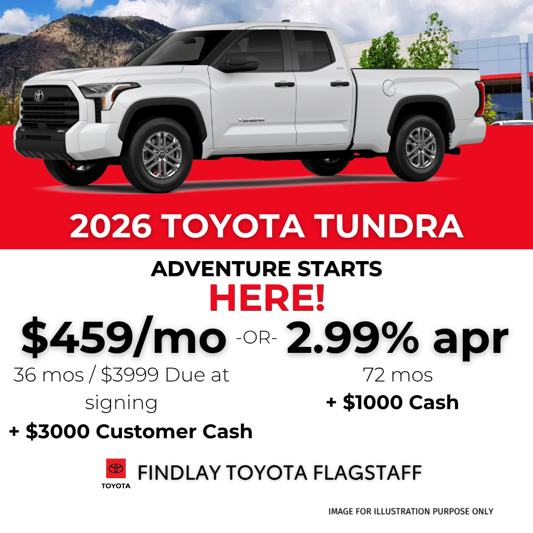 "Lease: Terms available on approved credit through Toyota Financial Services (TFS) at participating Toyota dealers. Not all customers qualify. Lease example based on 2026 Tundra 4WD Crew Max SR5 V6 10AT Model 8361 with Total SRP of $53,804, net capitalized cost of $48,350, and a lease end purchase amount of $36,049. $3,999 Due At Signing includes $2,790 customer down payment, first month's payment of $459 of the 36 month lease offer, and $750 Acquisition Fee. Security deposit required with exception of prior Toyota Financial Services (TFS) financing history and/or TFS credit rating in which a security deposit may be waived. Tax, title, license are extra. Dealer contribution may vary and could affect lease payment. Individual dealer prices, other terms and offers may vary. Must lease from participating dealer's stock and terms are subject to vehicle availability. Lessee responsible for maintenance, excess wear and use, and will pay $0.15 per mile for all mileage over 12,000 miles per year. $350 disposition fee is due at lease end.Offer cannot be combined with TFS Finance Cash, Down Payment Assistance, Trade-in Assistance, Customer Cash, APR, Finance Subvention Cash. Offer available in AZ, CO, NM, NV, UT, WY regardless of buyer's residency; void where prohibited. Expires 05-04-2026. Dealer sets final price. See your participating Toyota dealer for details.Toyota Financial Services is a service mark used by Toyota Motor Credit Corporation (TMCC). Retail installment accounts may be owned by TMCC or its securitization affiliates and lease accounts may be owned by Toyota Lease Trust (TLT) or its securitization affiliates. TMCC is the servicer for accounts owned by TMCC, TLT, and their securitization affiliates.""Customer Cash: $3,000 Customer Cash from Toyota Motor Sales, U.S.A. Inc. on a new 2026 Tundra from participating dealer's stock and subject to vehicle availability. Offer cannot be combined with TFS Finance Cash, TFS Lease Cash, Down Payment Assistance, Trade-in Assistance, Customer Cash, APR, Lease, Finance Subvention Cash, Lease Subvention Cash. Offer available in AZ, CO, NM, NV, UT, WY regardless of buyer's residency; void where prohibited. Expires 05-04-2026. Dealer sets final price. See your participating Toyota dealer for details.Toyota Financial Services is a service mark used by Toyota Motor Credit Corporation (TMCC). Retail installment accounts may be owned by TMCC or its securitization affiliates and lease accounts may be owned by Toyota Lease Trust (TLT) or its securitization affiliates. TMCC is the servicer for accounts owned by TMCC, TLT, and their securitization affiliates." "APR: Qualified customers who finance a new 2026 Tundra can receive as low as 2.99% APR for 72 months with 72 monthly payments of $15.19 for every $1,000 financed. Terms available on approved credit through Toyota Financial Services (TFS) at participating Toyota dealers. For only very well qualified customers. Cash offer must be applied toward required down payment amount or percentage. Amount financed, down payment amount, and credit worthiness may impact availability of offer. There is no cash back option. Dealer contribution may vary and could affect price. Individual dealer prices, other terms and offers may vary. Must take retail delivery from dealer's stock and terms subject to vehicle availability. Offer cannot be combined with TFS Lease Cash, Down Payment Assistance, Trade-in Assistance, Customer Cash, Lease, Lease Subvention Cash. See your participating Toyota dealer for details. Dealer sets final price. Offer available in AZ, CO, NM, NV, UT, WY regardless of buyer's residency; void where prohibited. Expires 05-04-2026.Toyota Financial Services is a service mark used by Toyota Motor Credit Corporation (TMCC). Retail installment accounts may be owned by TMCC or its securitization affiliates and lease accounts may be owned by Toyota Lease Trust (TLT) or its securitization affiliates. TMCC is the servicer for accounts owned by TMCC, TLT, and their securitization affiliates."