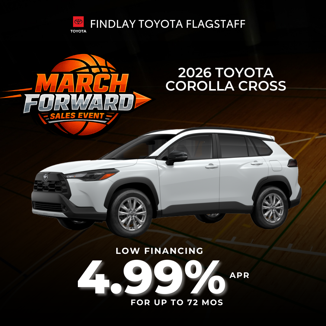 "APR: Qualified customers who finance a new 2026 Corolla Cross can receive as low as 4.99% APR for 72 months with 72 monthly payments of $16.10 for every $1,000 financed. Terms available on approved credit through Toyota Financial Services (TFS) at participating Toyota dealers. For only very well qualified customers. Amount financed, down payment amount, and credit worthiness may impact availability of offer. Dealer contribution may vary and could affect price. Individual dealer prices, other terms and offers may vary. Must take retail delivery from dealer's stock and terms subject to vehicle availability. Offer cannot be combined with TFS Lease Cash, Down Payment Assistance, Trade-in Assistance, Customer Cash, Lease, Lease Subvention Cash. See your participating Toyota dealer for details. Dealer sets final price. Offer available in AZ, CO, NM, NV, UT, WY regardless of buyer's residency; void where prohibited. Expires 03-31-2026.Toyota Financial Services is a service mark used by Toyota Motor Credit Corporation (TMCC). Retail installment accounts may be owned by TMCC or its securitization affiliates and lease accounts may be owned by Toyota Lease Trust (TLT) or its securitization affiliates. TMCC is the servicer for accounts owned by TMCC, TLT, and their securitization affiliates."