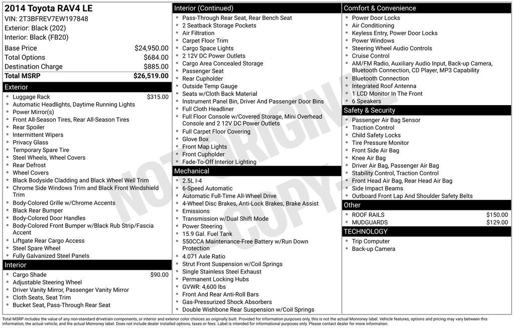 AWD, Black Cloth, 4-Wheel Disc Brakes, 4.071 Axle Ratio, 6 Speakers, ABS brakes, Air Conditioning, AM/FM radio, Brake assist, Bumpers: body-color, CD player, Driver door bin, Driver vanity mirror, Dual front impact airbags, Dual front side impact airbags, Electronic Stability Control, Exterior Parking Camera Rear, Fabric Seat Trim, Four wheel independent suspension, Front anti-roll bar, Front Bucket Seats, Front Center Armrest, Front reading lights, Illuminated entry, Knee airbag, Low tire pressure warning, Mudguards, Occupant sensing airbag, Outside temperature display, Overhead airbag, Overhead console, Panic alarm, Passenger door bin, Passenger vanity mirror, Power door mirrors, Power steering, Power windows, Radio data system, Radio: Entune AM/FM/CD/MP3/WMA Playback w/6 Spkers, Rear anti-roll bar, Rear seat center armrest, Rear window defroster, Rear window wiper, Remote keyless entry, Roof Rack Cross Bars, Roof Rails, Speed control, Speed-sensing steering, Split folding rear seat, Spoiler, Steering wheel mounted audio controls, Tachometer, Telescoping steering wheel, Tilt steering wheel, Tonneau Cover, Traction control, Trip computer, Wheels: 17 x 6.5J, AWD, Black Cloth.