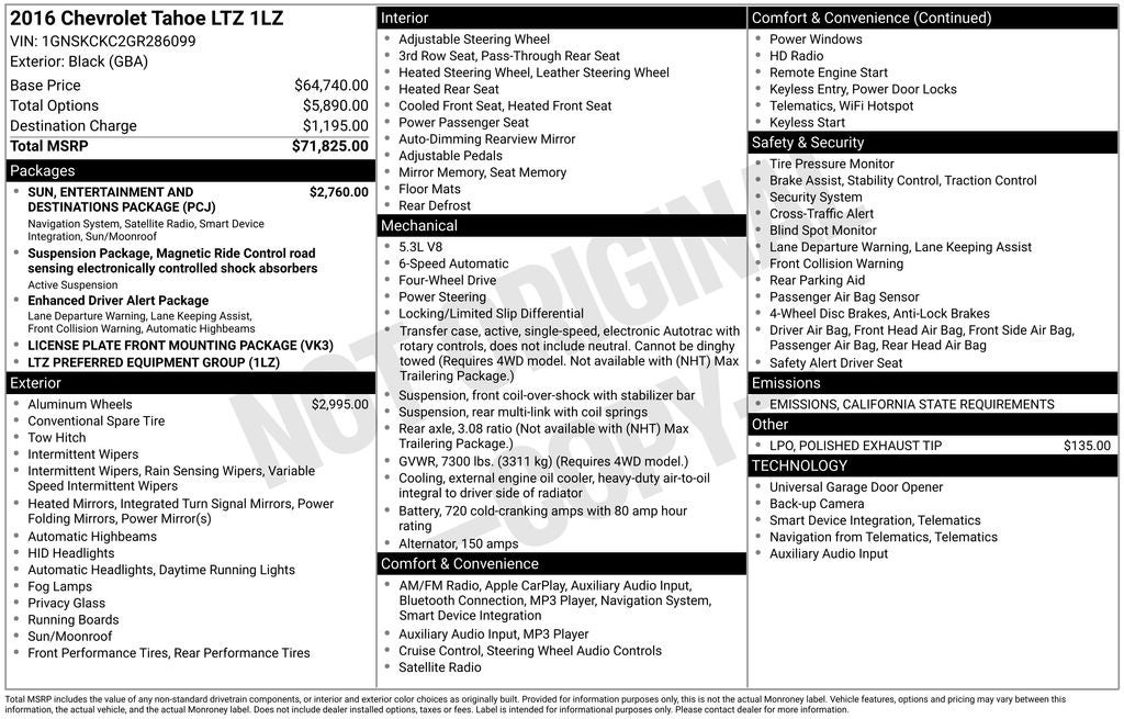 With its spacious interior, premium amenities, and capable powertrain, this 2016 Chevrolet Tahoe LTZ is the perfect choice for those seeking a versatile and well-equipped SUV. Whether you're shuttling the family, towing a trailer, or embarking on a road trip, this Tahoe is ready to handle it all with style and confidence.