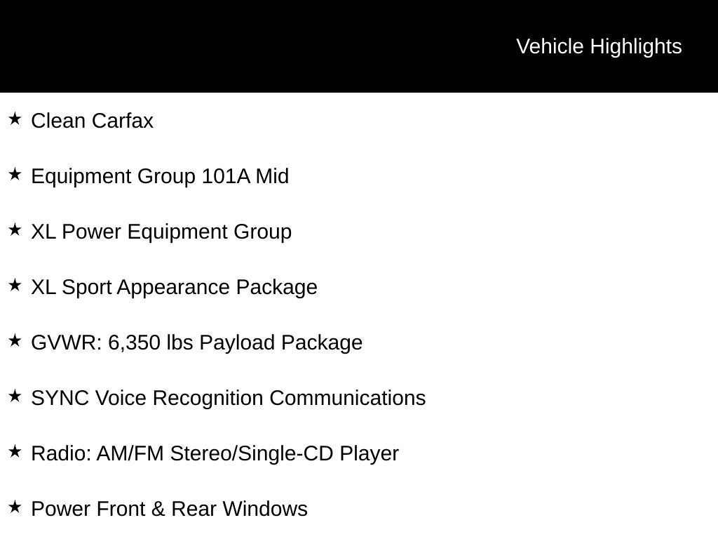 Inside, you'll find a host of convenient features, including SYNC Voice Recognition Communications, power windows, cruise control, and a 4.2-inch productivity screen in the instrument cluster. The XL Power Equipment Group provides power door locks, a power tailgate lock, and illuminated entry for added convenience.