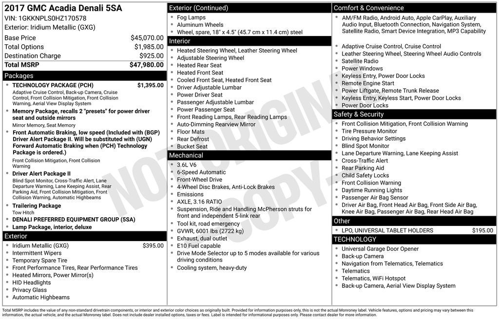 This stunning 2017 GMC Acadia Denali is the perfect blend of style, technology, and capability. Under the hood, you'll find a powerful 3.6L V6 engine mated to a smooth-shifting 6-speed automatic transmission, delivering an impressive 18 city/25 highway MPG. The sleek Iridium Metallic Gray exterior is complemented by a spacious and well-appointed interior, featuring premium leather-appointed seating, heated and ventilated front seats, and a state-of-the-art infotainment system with navigation.