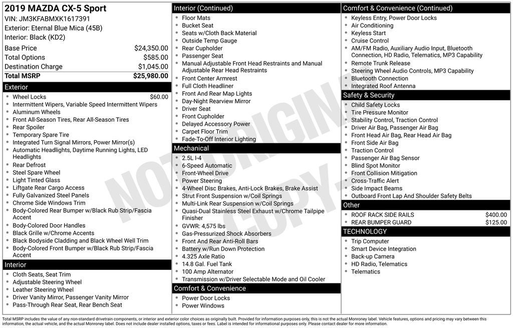This 2019 Mazda CX-5 Sport is the perfect blend of style, performance, and practicality. With its sleek blue exterior and spacious interior, this CX-5 is sure to turn heads wherever you go. Under the hood, you'll find a SKYACTIV® 2.5L 4-Cylinder DOHC 16V engine paired with a 6-Speed Automatic transmission, delivering an impressive 25 MPG in the city and 31 MPG on the highway.