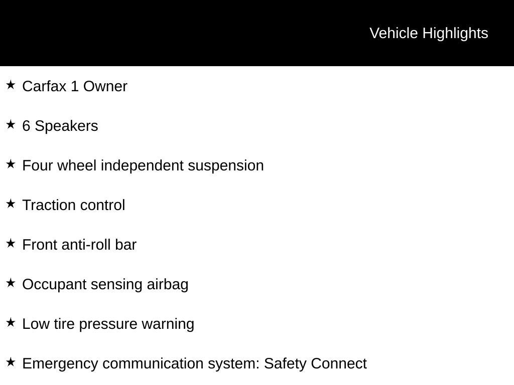 - 6 Speakers, Active Cruise Control, Brake assist, Electronic Stability Control, Four wheel independent suspension, Traction control, Auto High-beam Headlights, Fully automatic headlights, Apple CarPlay, 4-Wheel Disc Brakes, ABS brakes, Dual front impact airbags, Dual front side impact airbags, Emergency communication system: Safety Connect, Front anti-roll bar, Knee airbag, Low tire pressure warning, Occupant sensing airbag, Overhead airbag, Rear anti-roll bar, Wheels: 16 Wide Vent Steel
