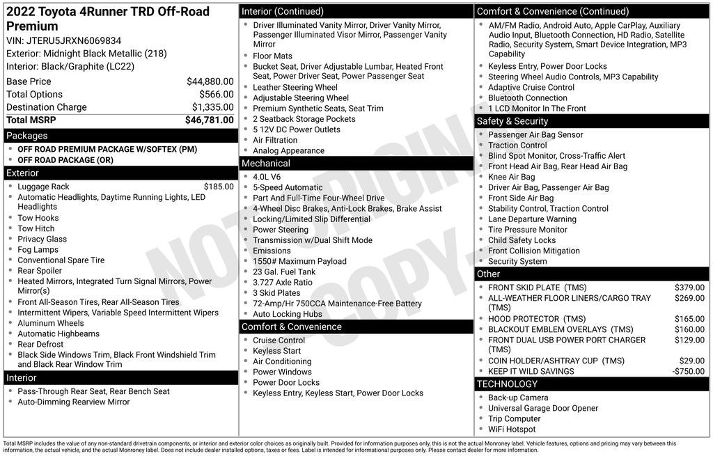 Backed by Toyota's renowned reputation for quality and reliability, this 4Runner is built to last. With low mileage and a clean Carfax history, this is an exceptional opportunity to own a well-maintained, off-road-ready SUV. Don't miss your chance to experience the uncompromising capability and premium features of this 2022 Toyota 4Runner TRD Off-Road Premium.