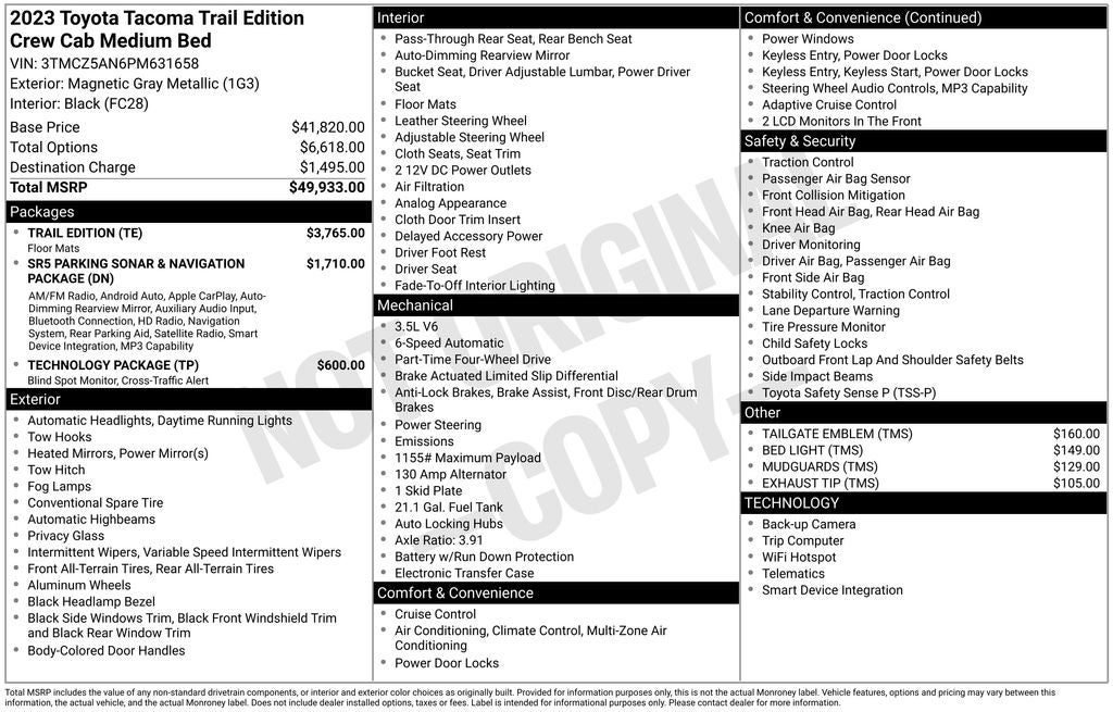 This Tacoma Trail Edition is equipped with a powerful 3.5L V6 engine that delivers 278 horsepower, paired with a smooth-shifting 6-speed automatic transmission and capable 4-wheel drive system. Featuring a Gray exterior, this truck boasts a rugged and adventure-ready persona, ready to take you wherever the road or trail may lead.