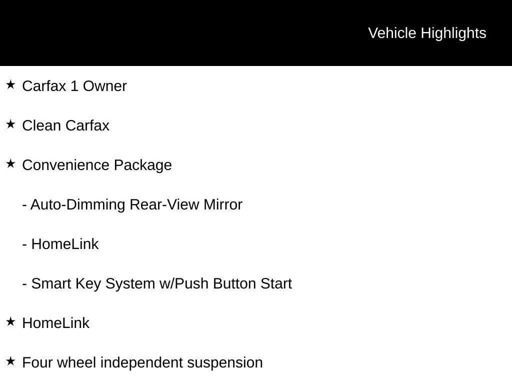 - Convenience Package (Includes HomeLink, Auto-Dimming Rearview Mirror, Smart Key System w/Push Button Start)
