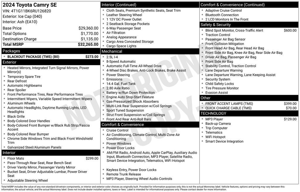 This 2024 Toyota Camry SE comes equipped with a 2.5L I4 DOHC 16V engine paired with an 8-Speed Automatic transmission and All-Wheel Drive. With an impressive EPA-estimated 25 MPG in the city and 34 MPG on the highway, this Camry SE delivers excellent fuel efficiency to keep you on the road longer between fill-ups. Additionally, the Camry SE's Blind Spot Monitor with Rear Cross-Traffic Alert, Blackout Package, and Rear Dual USB Power Ports provide added convenience and safety features that elevate the driving experience.