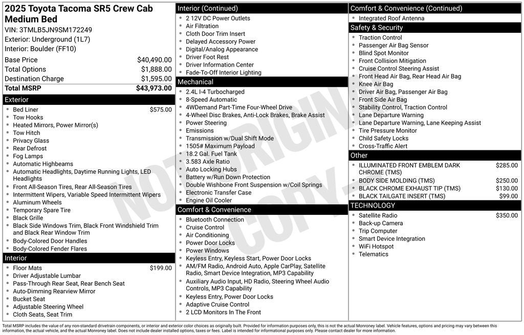 This 2025 Toyota Tacoma SR5 is the perfect blend of capability, technology, and style. Powered by a 2.4L 4-Cylinder engine mated to an 8-Speed Automatic transmission, this Tacoma delivers an impressive 19 city / 24 highway MPG. With its rugged 4WD system, you'll conquer any terrain with confidence.